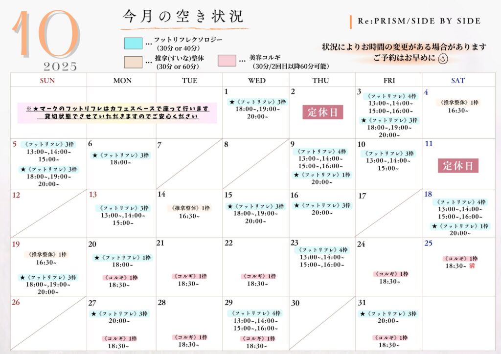 2025年10月 リラクゼーション スケジュール追加 2025年10月1日 最終更新日時 : 2025年10月1日 reprism 2025年10月のリラクゼーションスケジュールを追加致しましたので、ぜひご覧になって下さい♪ \ 最新情報をチェック /