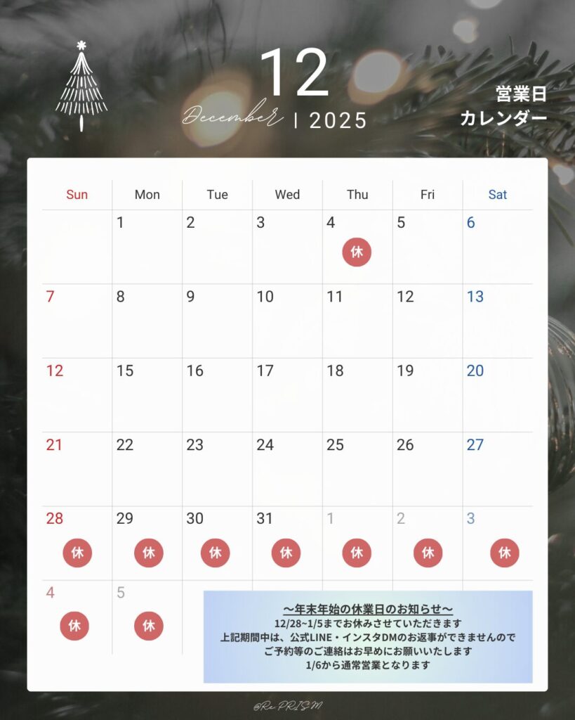 2025年12月の営業日をお知らせさせて頂きます 2025年11月26日 最終更新日時 : 2025年11月27日 reprism 12月28日~1月5日まで店舗がお休みとなります。 1月6日より通常営業をさせて頂きますのでどうぞ宜しくお願いいたします。 \ 最新情報をチェック /