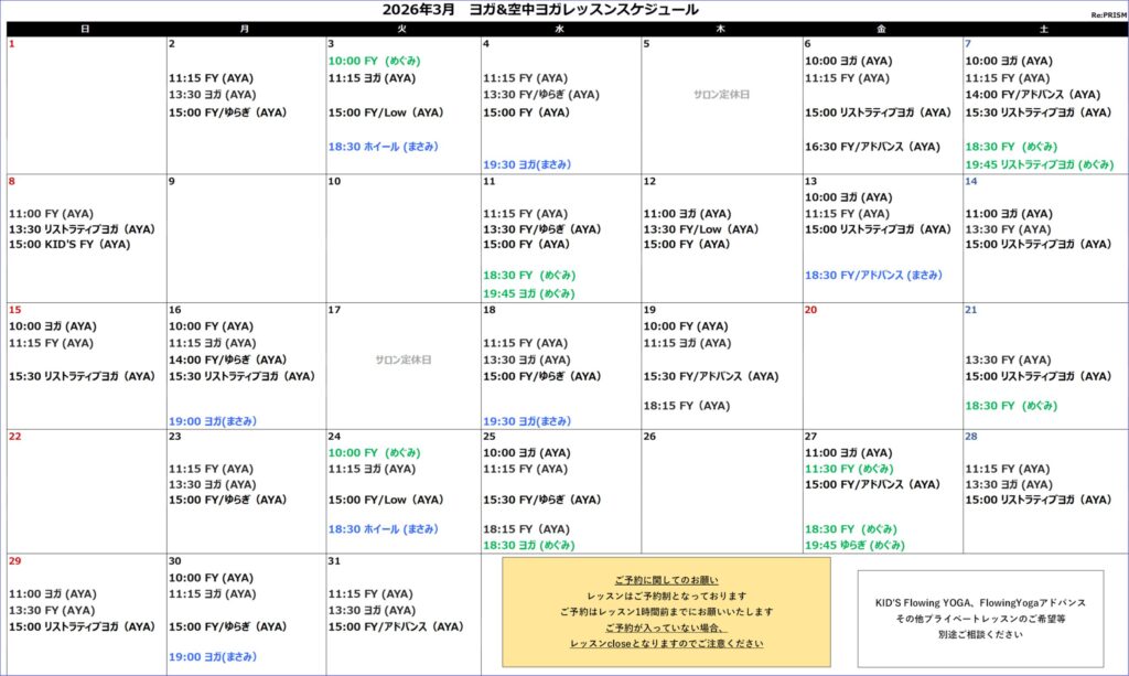 2026年3月 ヨガスケージュールを追加しました