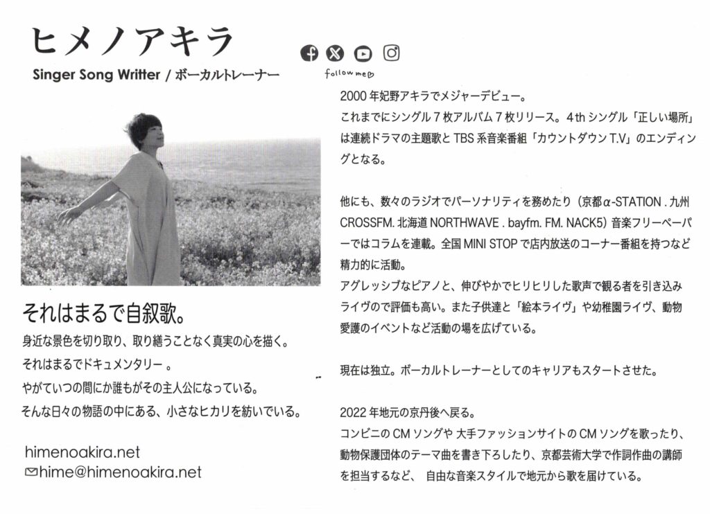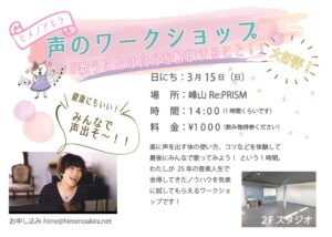 2026年3月15日 ヒメノアキラ様 『声のワークショック』ご案内 2026年2月28日 最終更新日時 : 2026年2月28日 reprism 2026年3月15日にヒメノアキラ様による声のワークショップが開催されます♪ 声の出し方やコツなどをヒメノアキラ様と一緒に体験できるワークショップです! 皆様のご参加をお待ちしております♪ \ 最新情報をチェック /